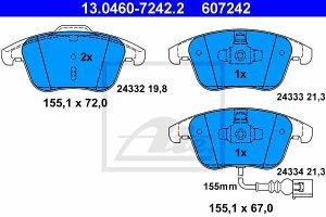 Prednje zavorne obloge 13.0460-7242.2 - VW, Seat, Audi. Lastnosti izdelka: Dolzina 155,2 mm, Visina 66,53 mm, Debelina 20,7 mm, Kvaliteta 300, Teza 2.241 kg, Izvedba osi Front, Tehnicna informacijska stevilka 181923, Zavorni sistem Ate - Teves, Kontrolna oznaka E9 90R-01111/2324, vkl. opozorilni kontakt obrabe, Dolzina 2 155,3 mm, Visina 2 71,73 mm, Debelina 2 19,7 mm.