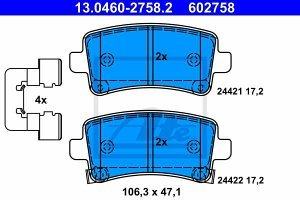 Prednje zavorne obloge 13.0460-2758.2 - Opel, Saab. Lastnosti izdelka: Sirina 106,4 mm, Visina 47,1 mm, Debelina 17,3 mm, z opozorilnim zvokom obrabe, Stev. Indikatorjev obrabe 4 p.osi, s priborom, Zavorni sistem TRW, st.izdelka priporocenega pribora 82503900. Cena velja za garnituro.