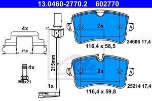 Zadnje zavorne obloge 13.0460-2770.2 - Audi A4, A6, A7. Zavorne ploščice pretvorijo kinetično energijo s pomočjo trenja dveh ploščic in vrtečega diska. Ponašajo se z visoko kvaliteto in zmogljivostjo ter zagotavljajo optimalno ustvarjanje trenja in toplote, ki omogoči vozilu da se ustavi oziroma se njegova hitrost zmanjša. Lastnosti izdelka: Sirina 1 116,4 mm, Visina 1 58,5 mm, Sirina 2 116,4 mm, Visina 2 59,8 mm, Debelina 17,4 mm, vkl. opozorilni kontakt obrabe, Stev. Indikatorjev obrabe 1 p.osi, Dolzina opozorilnega kontakta 215 mm, s priborom, s vijaki za sedlo kolutne zavore, stevila vijakov 4, Zavorni sistem Lucas / TRW, Kontrolna oznaka E1 90R-011115/1159. Cena velja za garnituro.