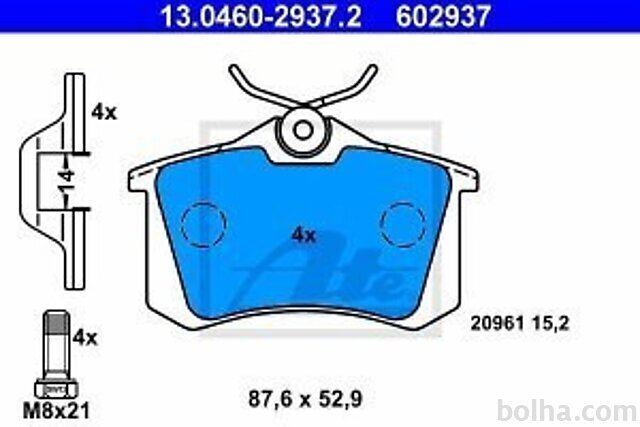Zadnje zavorne obloge 13.0460-2937.2 - VW, Audi. Zavorne ploščice pretvorijo kinetično energijo s pomočjo trenja dveh ploščic in vrtečega diska. Ponašajo se z visoko kvaliteto in zmogljivostjo ter zagotavljajo optimalno ustvarjanje trenja in toplote, ki omogoči vozilu da se ustavi oziroma se njegova hitrost zmanjša. Lastnosti izdelka: Sirina 87,6 mm, Visina 52,9 mm, Debelina 15,2 mm, brez opozorilnega kontakta obrabe, s priborom, s vijaki za sedlo kolutne zavore, stevila vijakov 4, Zavorni sistem Lucas / TRW. Cena velja za garnituro.