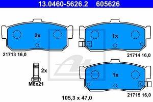 Zadnje zavorne obloge 13.0460-5626.2 - Nissan. Zavorne ploščice pretvorijo kinetično energijo s pomočjo trenja dveh ploščic in vrtečega diska. Ponašajo se z visoko kvaliteto in zmogljivostjo ter zagotavljajo optimalno ustvarjanje trenja in toplote, ki omogoči vozilu da se ustavi oziroma se njegova hitrost zmanjša. Lastnosti izdelka: Sirina 105,3 mm, Visina 47 mm, Debelina 16 mm, z opozorilnim zvokom obrabe, s vijaki za sedlo kolutne zavore, stevila vijakov 2, Zavorni sistem Akebono.