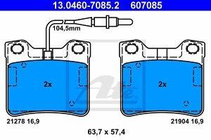 Zadnje zavorne obloge 13.0460-7085.2 - Mercedes Benz. Zavorne ploščice pretvorijo kinetično energijo s pomočjo trenja dveh ploščic in vrtečega diska. Ponašajo se z visoko kvaliteto in zmogljivostjo ter zagotavljajo optimalno ustvarjanje trenja in toplote, ki omogoči vozilu da se ustavi oziroma se njegova hitrost zmanjša. Lastnosti izdelka: Sirina 63,7 mm, Visina 57,4 mm, Debelina 16,9 mm, vkl. opozorilni kontakt obrabe, Stev. Indikatorjev obrabe 2 p.osi, Dolzina opozorilnega kontakta 104,5 mm, Zavorni sistem ATE, Kontrolna oznaka E1 90R-01310/135.