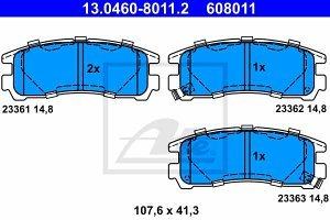 Zadnje zavorne obloge 13.0460-8011.2 - Mitsubishi 3000 GT. Lastnosti izdelka: Dolzina 107,6 mm, Visina 41,3 mm, Debelina 15 mm, Kvaliteta 944, Teza 0.903 kg, Izvedba osi Rear, Tehnicna informacijska stevilka 141192, Zavorni sistem Akebono, Kontrolna oznaka E1 90R-01100/066, vkl. opozorilni kontakt obrabe.