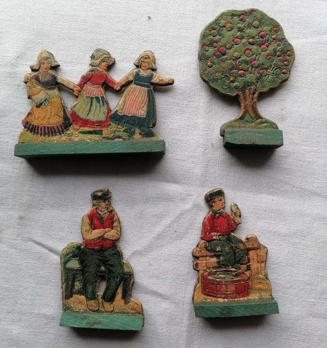 Prodam zelo star set otroških igrač – figuric. Figurice so iz kartona, obojestransko pobarvane in na lesenih podstavkih. Zelo lepo ohranjeno.