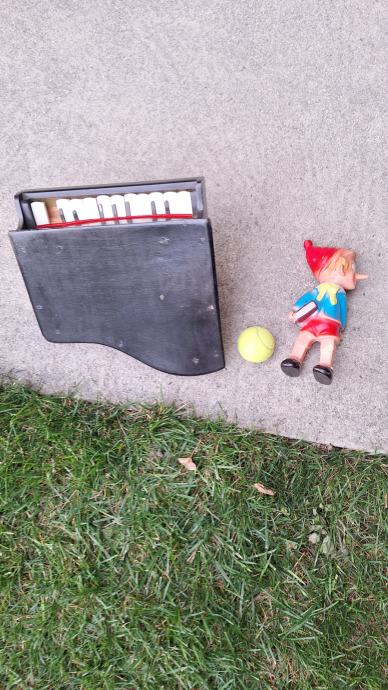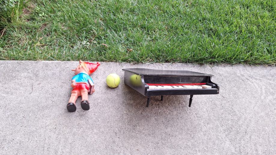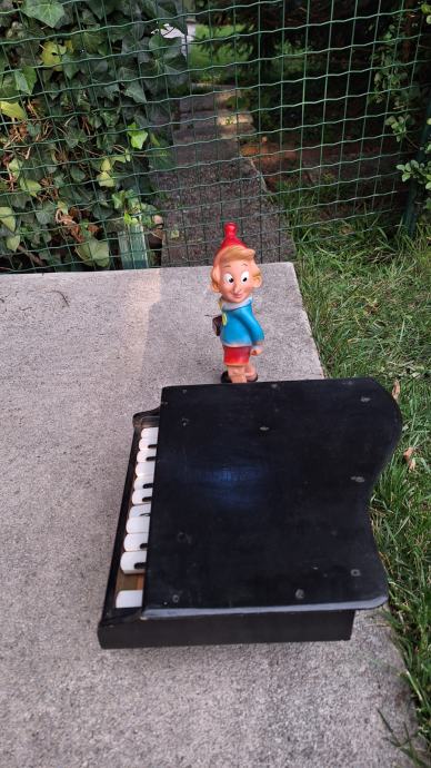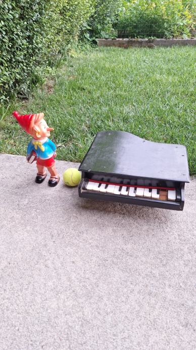 Miniaturen klavirček (s tremi nogami, manjka ena tipka, malce razglašen, sicer pa povsem delujoč) iz 50. let ali zelo verjetno še starejši. Na voljo tudi gumijasta lutka Ostržek iz 70. let, v odličnem stanju. Oba predmeta sta reariteta, najdena med pospravljanjem podstrešja. Samo resni. Teniška žogica poleg je za primerjavo velikosti.