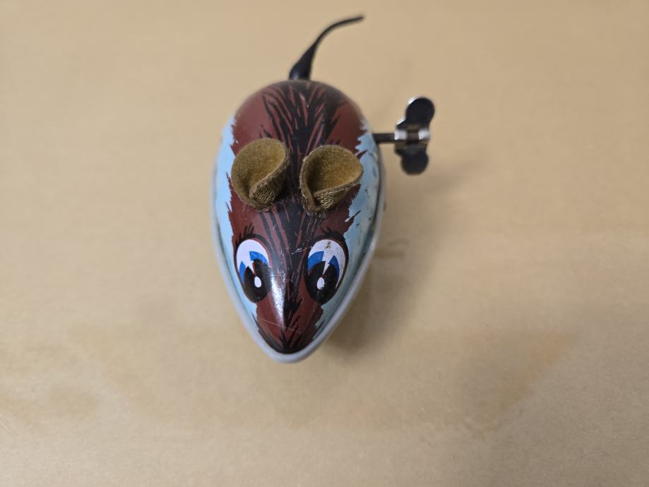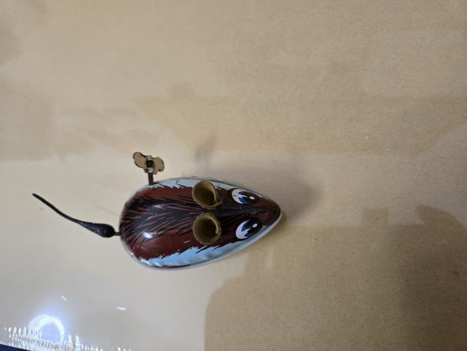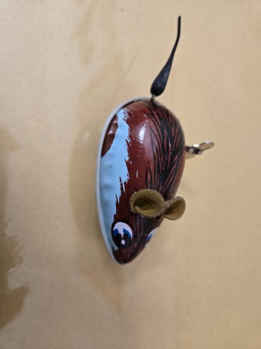 Prodam miško kovinsko pločevinasto plehnato, na navijanje. Igrača deluje brezhibno. Funkcija mehanizma je premikanje naprej in vrtenje z repom.