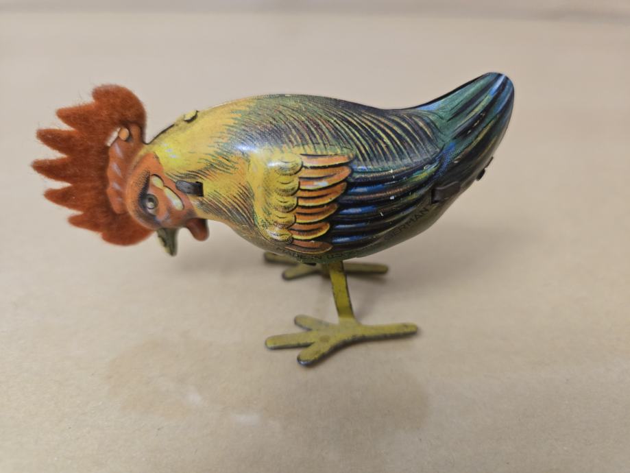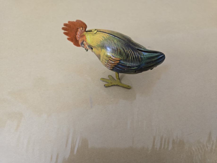 Prodam vintage koviskega plehnatega pločevinastega petelina, narejenega v zahodni Nemčiji. Igrača deluje na navijanje. Ko se navije, skače na podlagi. Deluje brezhibno. Zraven je še originalni ključ. Igrača je sicer lepo ohranjena, vendar na žalost brez škatle.