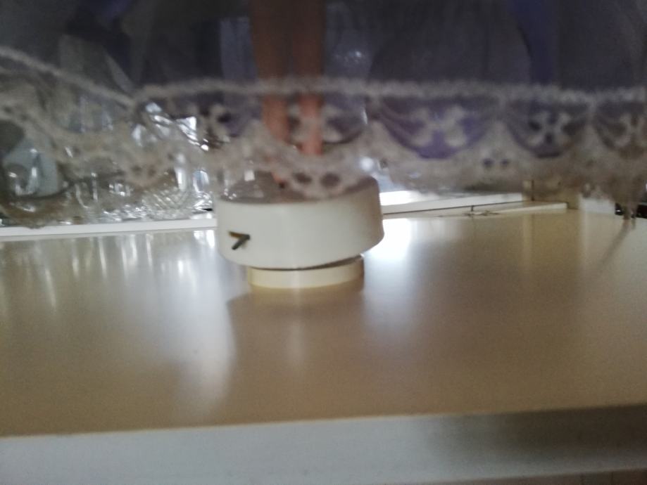 Lutka plesalka iz tekstila na mehanskem podnožju. Ob navitju se lutka vrti okoli svoje osi.