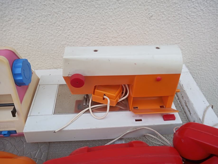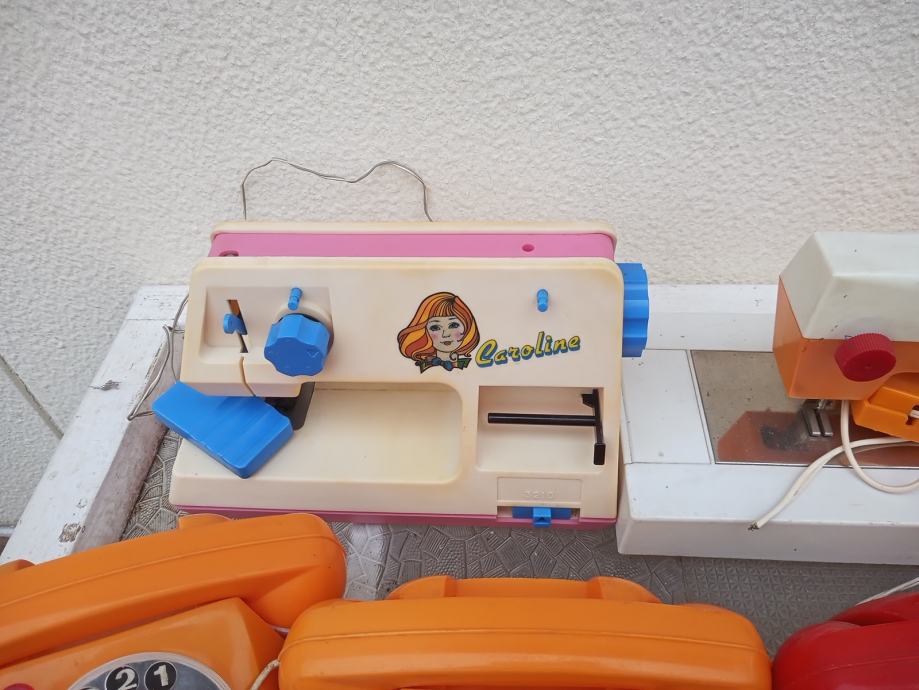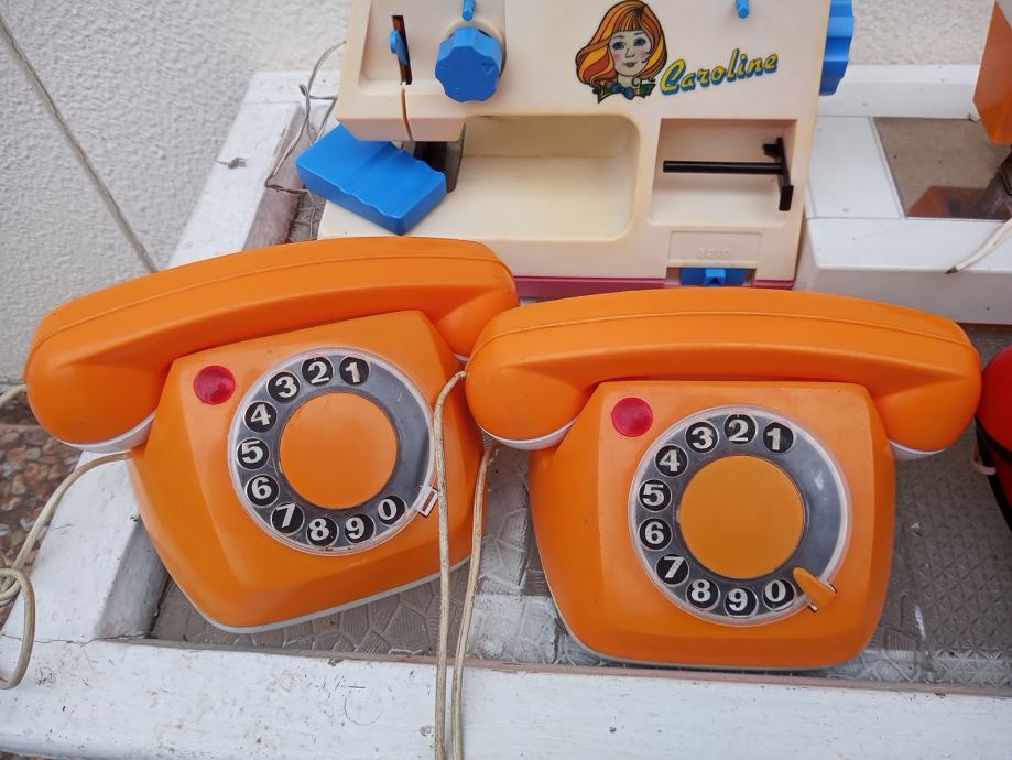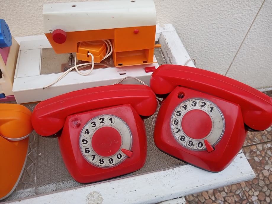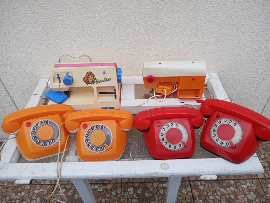 Rdeča telefona slabše ohranjena, Caroline šivalni stroj motor vrti, drugi nepreizkušen. Telefoni nepreizkušeni.