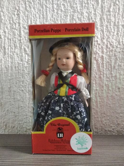 V originalni embalaži in brezhibno ohranjena, kot nova, porcelanasta punčka v narodni noši iz Innsbrucka, višine 18 cm. Porcelanasta punčka je ročno delo, proizvod Edeltraut Hofmann.