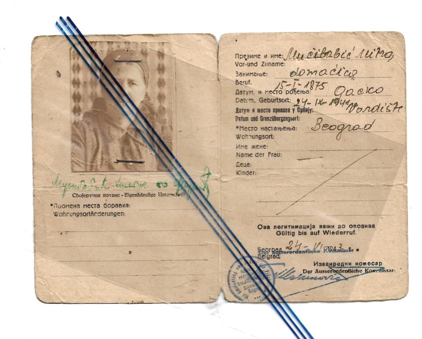 Begunska izkaznica ženske iz Gackega, ki je prišla v Srbijo leta 1943, dvojezični tekst - cirilica, nemščina, fotografija.
