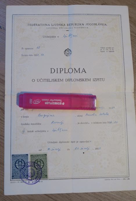 Federativna ljudska republika Jugoslavija - Ljudska republika Slovenija, Učiteljišče v Ljubljani. Diploma o učiteljskem diplomskem izpitu, 1953. Šolstvo.