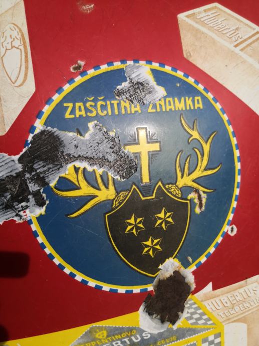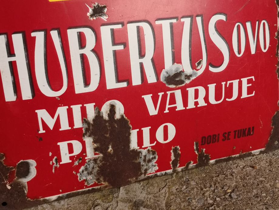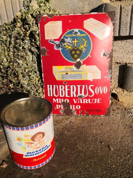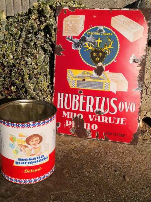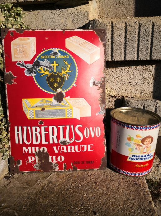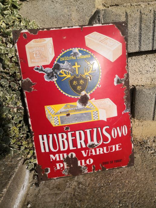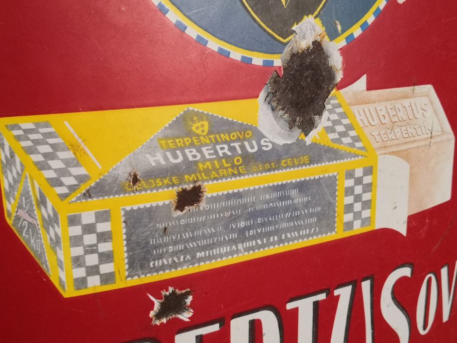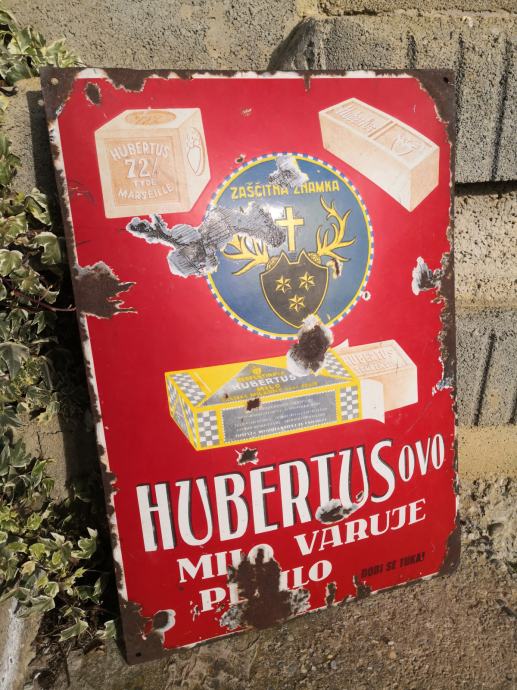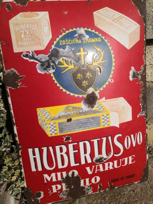 - velika emajlirana kovinska tabla HZBERTUSOVO MILO VARUJE PERILO, terpentinovo hubertus milo, stanje na slikah, REDKOST, napis v slovenščini in angleščini, email, velikost ca 65 X 45 cm,