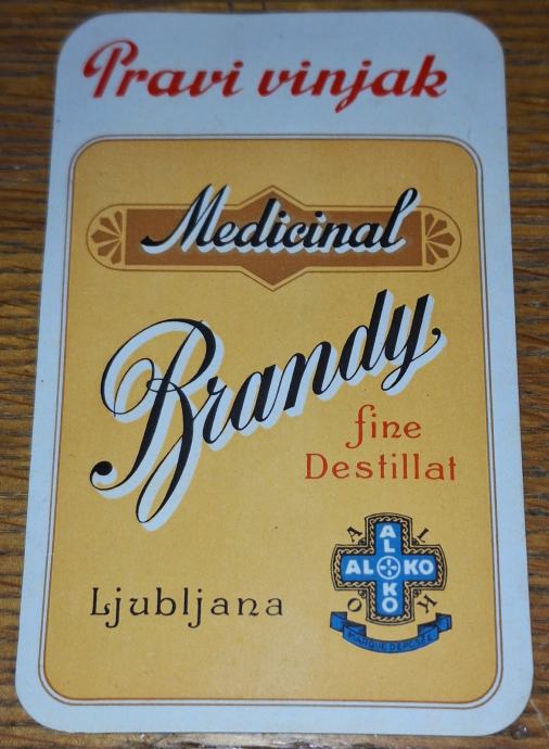 Prodam staro, nerabljeno steklenično etiketo Pravi vinjak Brandy, Alko Ljubljana, kot je vidna na fotografiji.