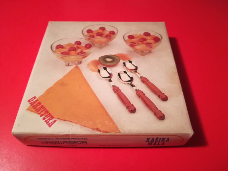 Prodam komplet NE rabljenih malih kavnih, desertnih žličk na sliki. Narejeno v Jugoslaviji. V kompletu je 6 žličk in ne 3,kot je na sliki