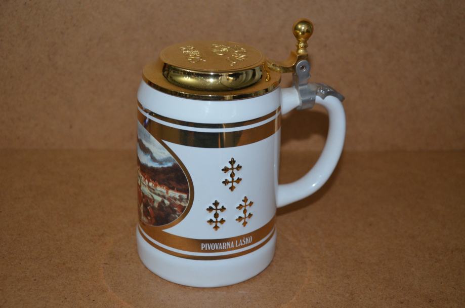 Keramični vrč, PIVOVARNA LAŠKO, višina 140 mm, spodaj 100 mm, zgoraj 90 mm, z pokrovom. Izdelal KILI Liboje.