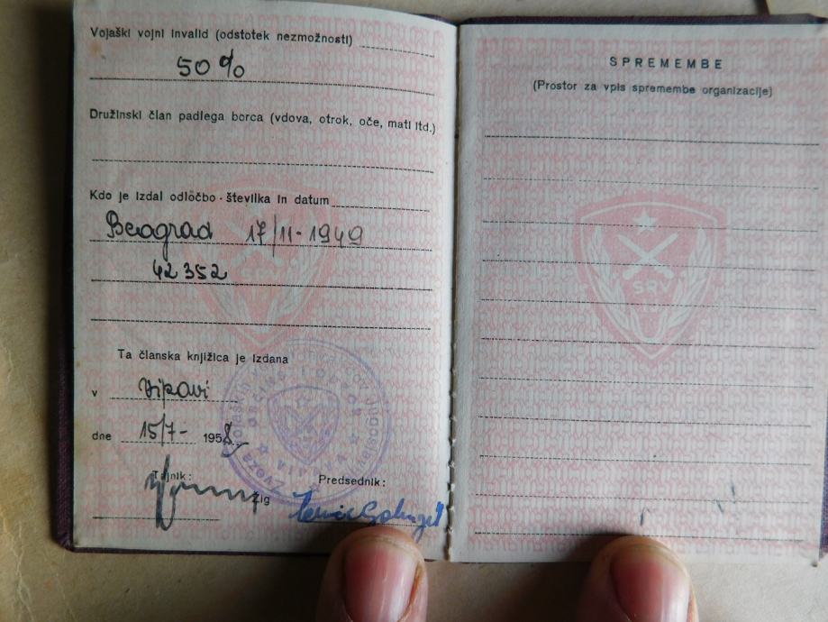 Knjižica jugoslovanskih vojnih invalidov- brez slike.