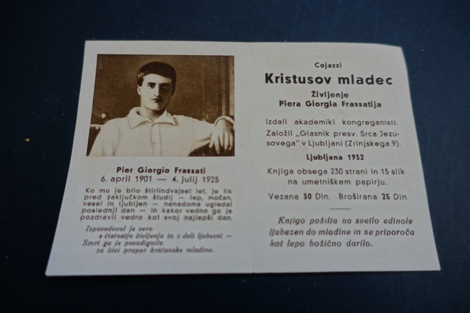 Izgleda, da je to reklama za knjigo Kristusov mladec, zraven je tudi cena 30 Din za vezano in 25 Din za broširano, avtor Pier Giorgio Frassati