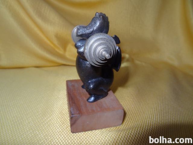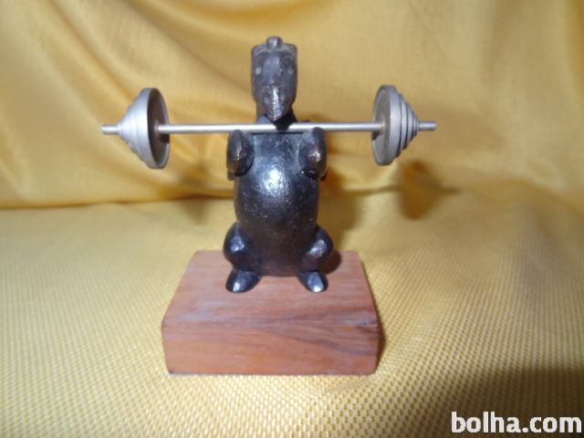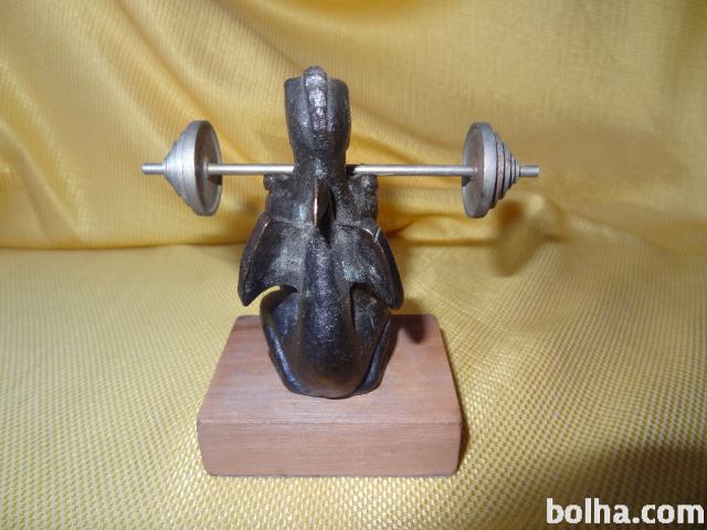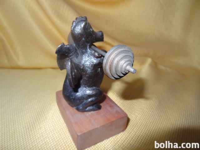 10 (DEST)- centimeterska, Z LESENIM PODSTAVKOM 12 cm BRONASTA MASKOTA ZMAJČEK S PRVENSTVA V DVIGOVANJU UTEŽI1982 - SPDU V LJUBLJANI. DVIGOVANJE UTEŽI JE EDEN NAJSTAREJŠIH OLIMPIJSKIH ŠPORTOV,. OMOGOČA RAZVOJ VISOKE RELATIVNE MOČI POSAMEZNIKA.