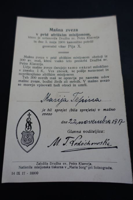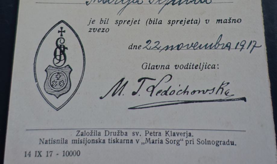 Izdana je bila 22.november 1917 - M.T. je bila sprejeta v mašno zvezo