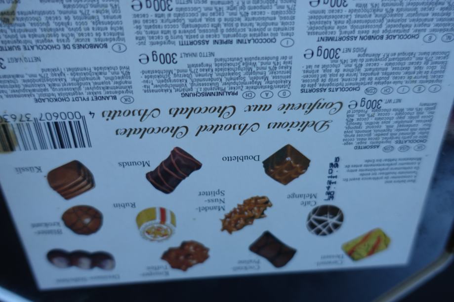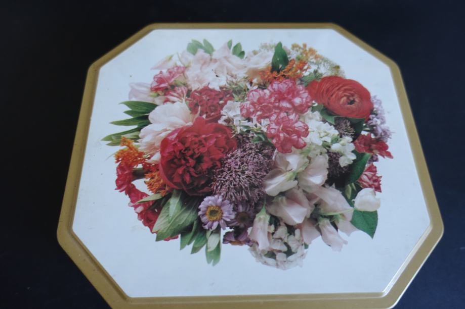 V njej so bili piškoti. Zadaj je napisan rok uporabe 1995, tako da je škatla iz leta 1995 ali še starejša.