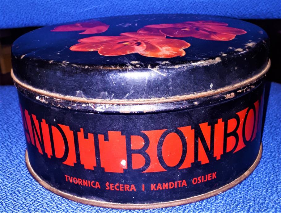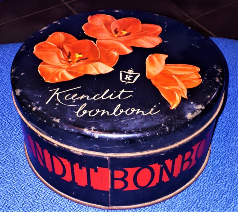 Prodam plehnato škatlo Kandit bonboni, premera cca 20,5 cm, kot je vidna na fotografijah.