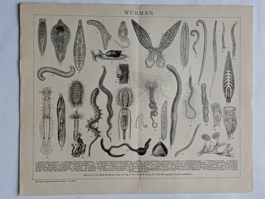 Podrobne ilustracije različnih črvov in parazitov pod mikroskopom.
