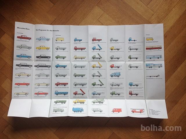 Prodm prospekt proizodnega programa vozil Mercedes Benz leta 1964. Nemški jezik. Prospekt je v odličnem stanju. Osnova je mali format 21x6 cm v A3 format.. 031 221 383