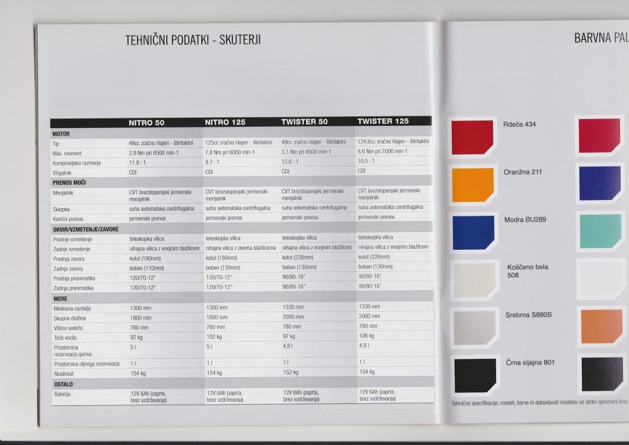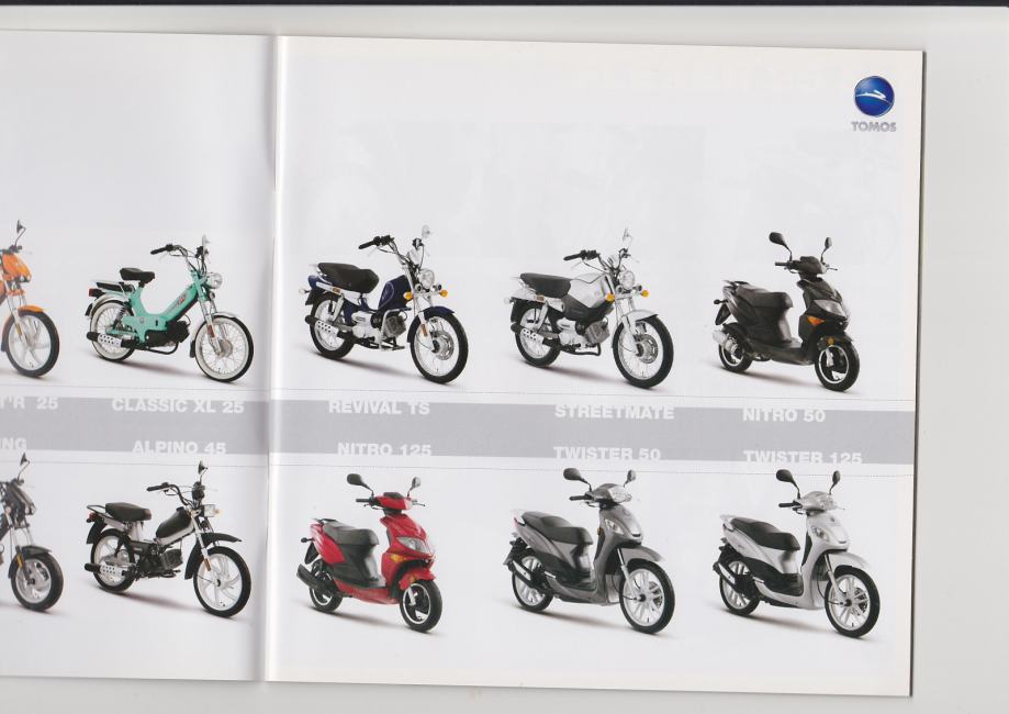 YOUNGST'R FUUL, RACING, ALPINO 45, REVIVAL TS, STREETMATE, NITRO 50, NITRO 125, TWISTER 50, TWISTER 125. Prodaja se katalog s slike , ki ima 34 strani. Na vsaki strani je predstavljen en zgoraj napisan model mopeda. Slovenska verzija. Kupec plača poštnino.