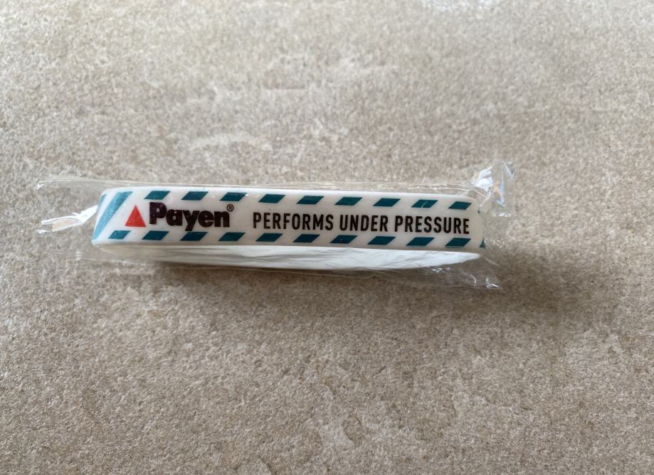 Prodam NOVO silikonsko ZAPESTNICO Payen, v beli barvi z zelenim prečnim črtastim vzorcem ter črnim napisom: "PERFORMS UNDER PRESSURE" (= deluje pod pritiskom), ki je primerna tudi za športnike :)