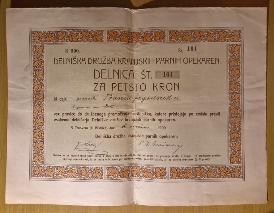 Stara velika delnica 1909. Delniška družba kranjskih parnih opekaren