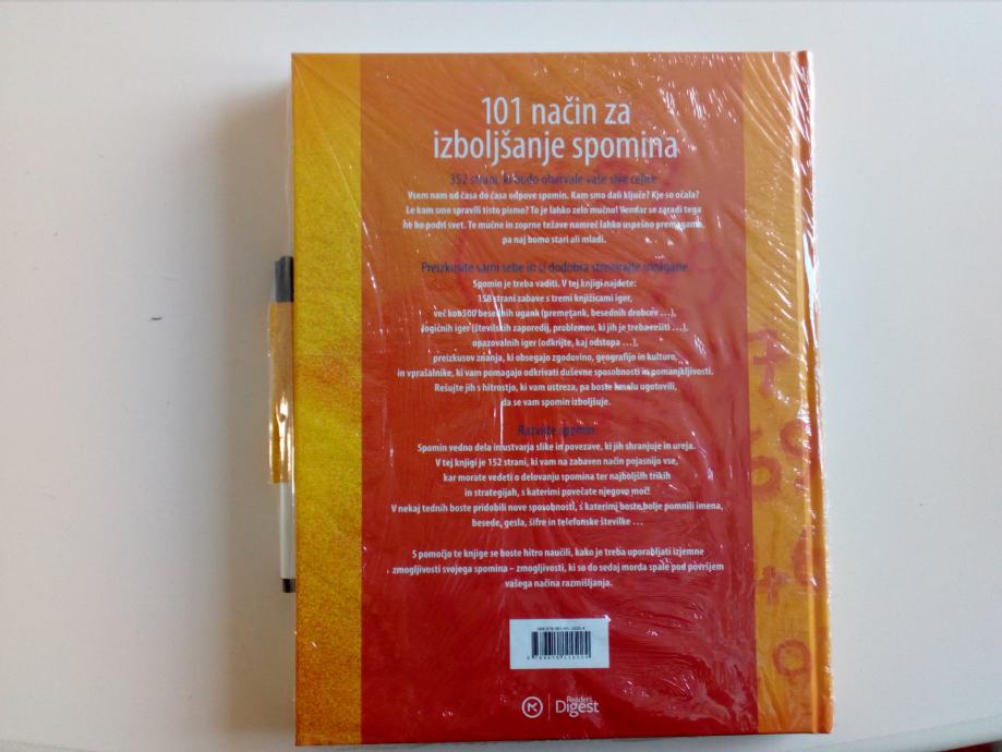 Prodam novo knjigo, ki je še zavita v folijo. Knjiga ima 352 strani, v njej pa so razne igre, triki in strategije za izboljšanje spomina. Knjigo je izdala Mladinska knjiga.