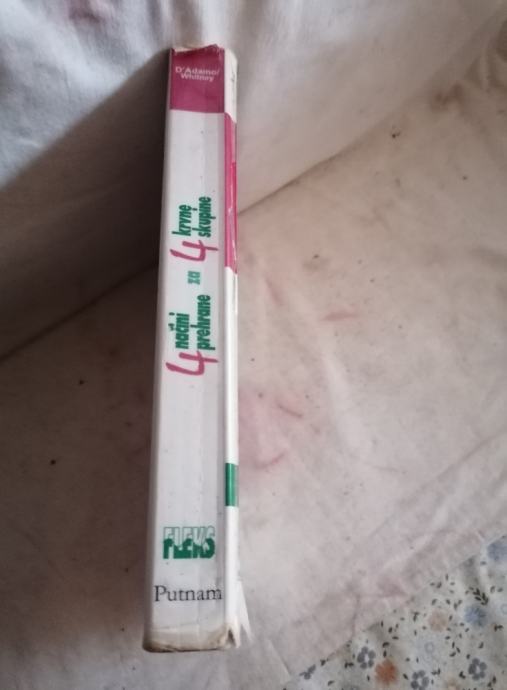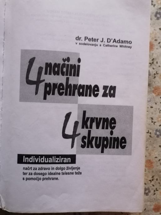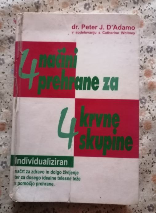 Na voljo je solidno ohranjena knjiga 4 načini prehrane za 4 krvne skupine Individualiziran načrt za zdravo in dolgo življenje ter za dosego idealne telesne teže s pomočjo prehrane, avtor dr. Peter J. DiAdamo,