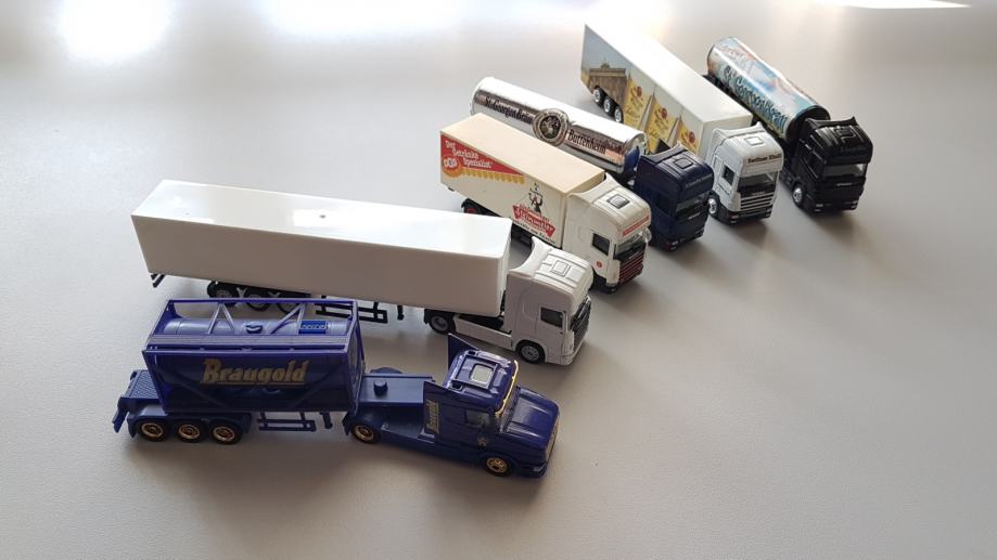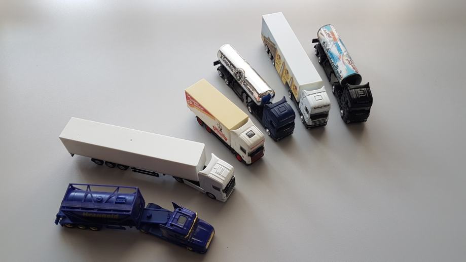Tovornjaki so kombinacija diecast/plastika ali samo plastika (Herpa, Wiking, Schuco in drugi).