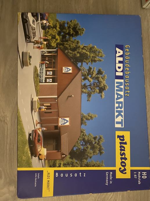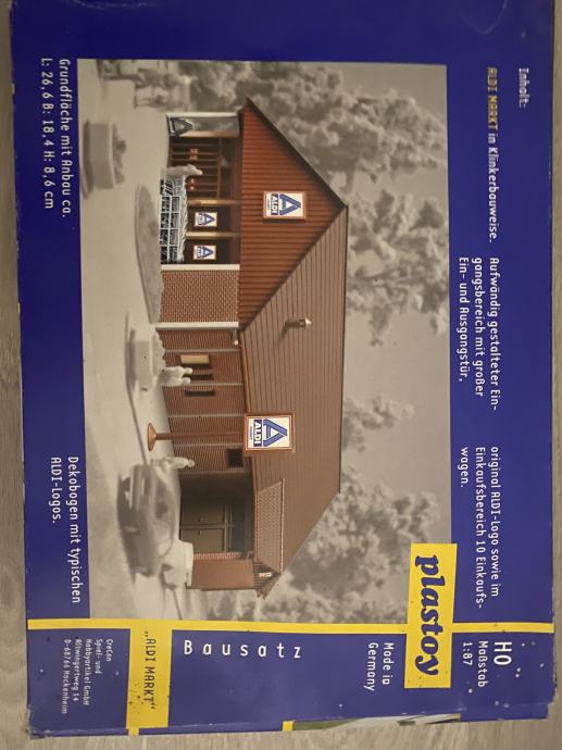 Nerabljena, nesestavljena stavba marketa, primerna za nadgradnjo makete. Skatla ima sledi skladiscenja.