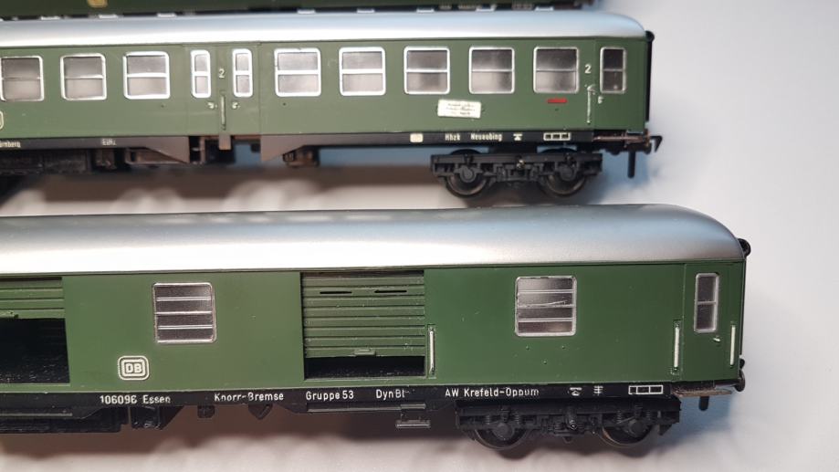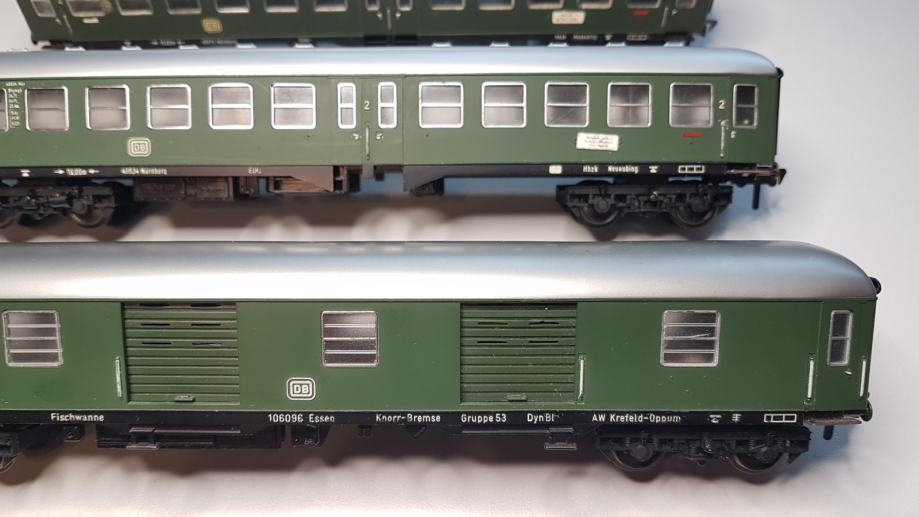 Prodam lepe DB vagone, komplet sestavljajo 3 vagoni, eden od teh poštni, kateremu se odpirajo/zapirajo vsa 4 nakladalna vrata, super detajl, za postavit ob postajo etc. Glejte slike.