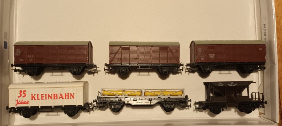 Prodam HO vagone Kleinbahn, brezhibni, 7€ kos, spodnja dva odprta sta prodana. Vse 3 za 21€, enemu rjavemu zaprtemu vagonu manjkajo trije buferji in ga podarim. Tel:040505029
