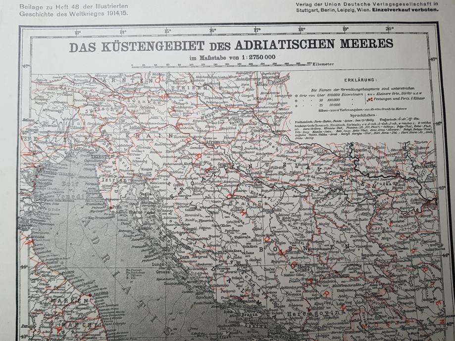 ODLIČNO OHRANJEN ZEMLJEVID OBALE JADRANSKEGA MORJA ZA POTREBE V 1.SV.VOJNI 1914-15.