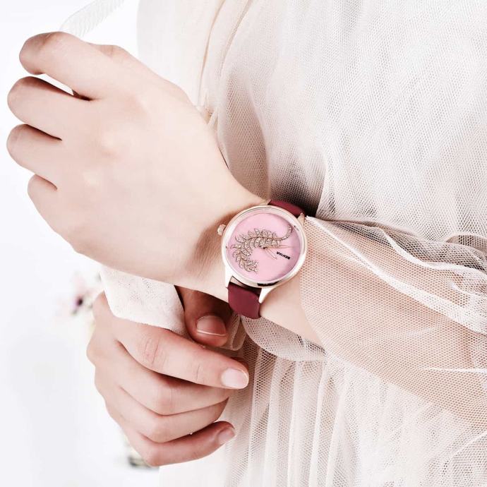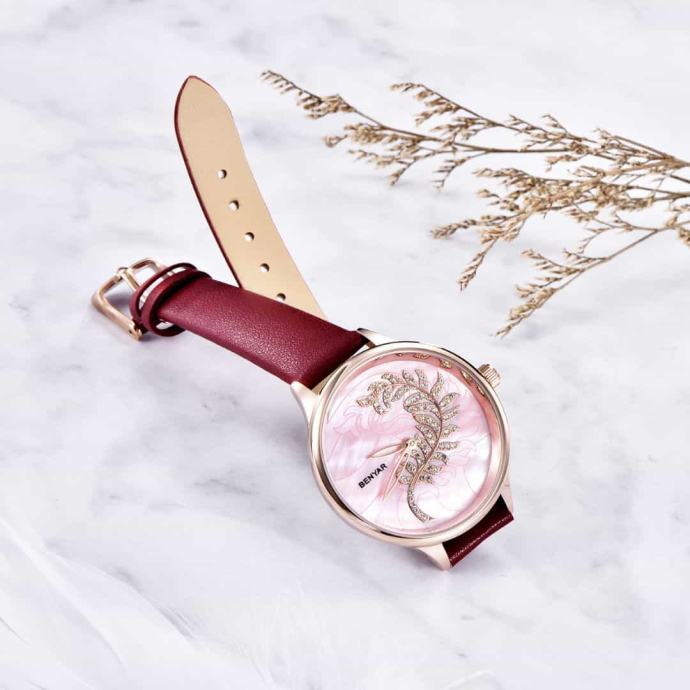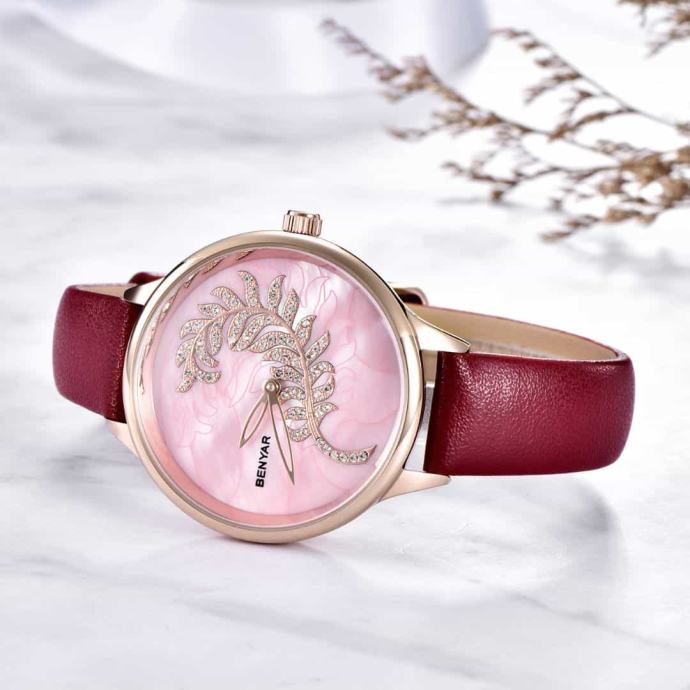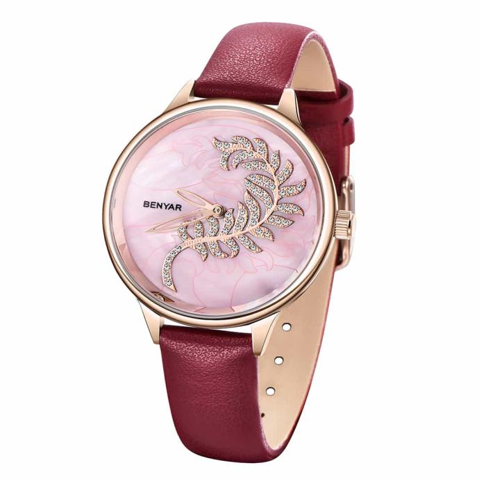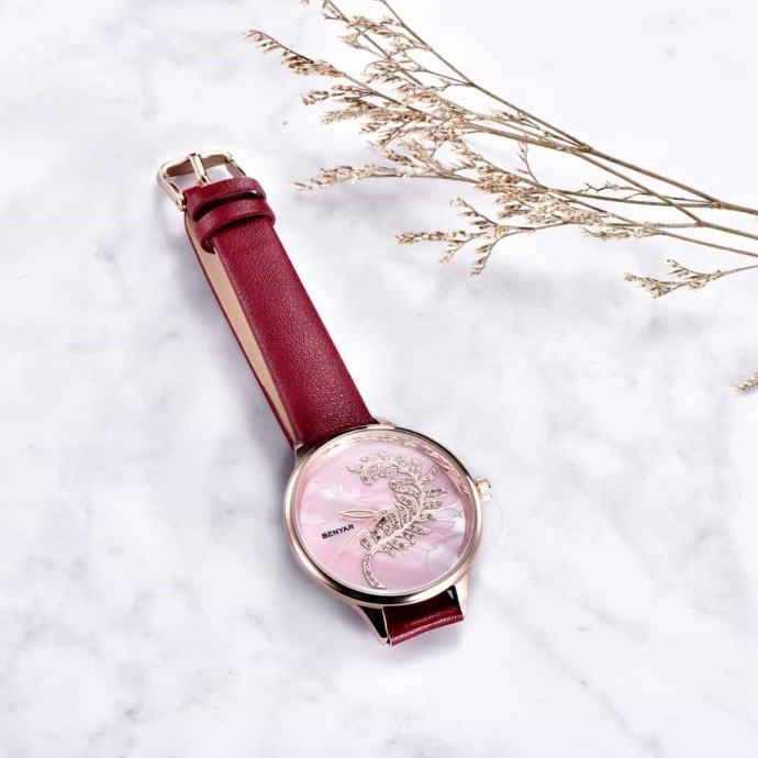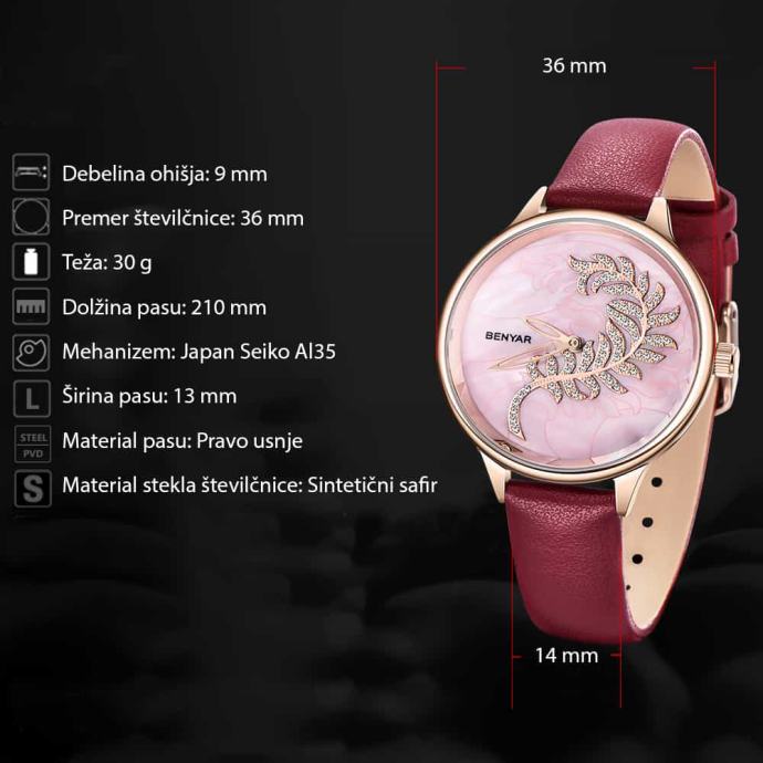Ženska ročna ura Benyar Blossom Lether RedOdkrijte popolno kombinacijo umetnosti in elegance z žensko ročno uro Benyar Blossom Lether Red. Ta čudovita ura je ustvarjena za ženske, ki cenijo lepoto in prefinjenost v vsakem detajlu. Ženska ročna ura Benyar Blossom Lether Red se ponaša z očarljivo roza številčnico, ki je okrašena s prefinjenimi srebrnimi cvetličnimi motivi. Ti motivi ujamejo svetlobo pod vsakim kotom in ustvarjajo očarljiv vizualni učinek, ki bo zagotovo pritegnil občudovanje. Sintetični safir, ki pokriva številčnico, zagotavlja izjemno odpornost na praske in ohranja uro v popolnem stanju.Ura je opremljena s kakovostnim rdečim usnjenim paščkom, ki zagotavlja udobje in trajnost. Rdeča barva paščka dodaja drznost in sofisticiranost, kar bo zagotovo izstopalo na vašem zapestju. Dolžina paščka je 210 mm, širina pa 14 mm, kar zagotavlja popolno prileganje vsakemu zapestju.Benyar Blossom Lether Red ima premer številčnice 36 mm in debelino ohišja 9 mm, kar ustvarja uravnotežen in eleganten videz. Zanesljiv japonski mehanizem Seiko AI35 zagotavlja natančnost in vzdržljivost. Celotna teža ure je 30 g, kar jo naredi lahkotno in udobno za nošenje skozi ves dan. Debelina ohišja: 9 mm Premer številčnice: 36 mm Teža: 30 g Dolžina paščka: 210 mm Širina paščka: 14 mm Material paščka: Usnje Material stekla številčnice: Sintetični safir Mehanizem: Japan Seiko AI35Benyar Blossom Lether Red je več kot le ura – je izjava o vašem prefinjenem okusu in občutku za stil. Nosite jo ob vsaki priložnosti, od poslovnih sestankov do elegantnih večernih dogodkov, in dovolite, da postane vaš najljubši modni dodatek.Ne čakajte več! Dodajte pridih luksuza svojemu vsakdanjiku z žensko ročno uro Benyar Blossom Lether Red. Naročite zdaj in postanite lastnik te čudovite ure, ki bo zagotovo obogatila vašo zbirko modnih dodatkov. Ura ima 12 mesečno garancijo.V kolikor z nakupom niste zadovoljni, lahko ročno uro v roku 60-ih dni od prejema vrnete na naš naslov, mi pa vam bomo vrnili kupnino.