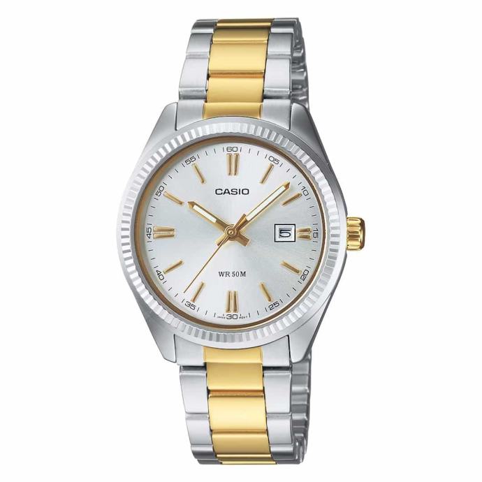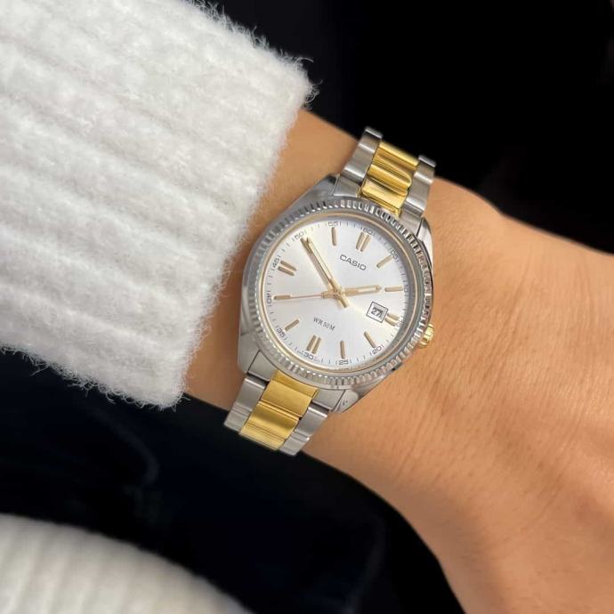 Ženska ročna ura Casio Collection LTP-1302PSG-7AVEGŽenska ročna ura Casio Collection LTP-1302PSG-7AVEG združuje klasično eleganco in zanesljivost, ki jo ponuja priznana blagovna znamka Casio. S kombinacijo srebrne in zlate barve na ohišju ter zapestnici iz nerjavečega jekla je popolna izbira za vsakodnevno uporabo in posebne priložnosti. Ta model izstopa s prefinjeno estetiko ter funkcionalnostjo, ki zagotavlja brezskrbno nošenje.Lastnosti in prednosti ure: Ohišje in zapestnica iz nerjavečega jekla: Trpežna konstrukcija z dvojnim barvnim tonom za prefinjen videz in dolgotrajno obstojnost. Srebrna številčnica z zlatimi detajli: Elegantna kombinacija barv in kontrastni kazalci omogočajo odlično berljivost. Mineralno steklo: Odporno na praske, ščiti številčnico in ohranja brezhiben videz. Vodoodpornost 5 ATM: Zasnovana za brezskrbno vsakodnevno nošenje. Prikaz datuma: Praktična funkcija na položaju 3. ure omogoča enostavno spremljanje koledarja.Tehnične lastnosti: Premer ohišja: 30 mm – idealna velikost za prefinjen in ženstven videz. Debelina ohišja: 9 mm – uravnotežena zasnova za udobno celodnevno nošenje. Material ohišja: Medenina z nerjavečim jeklom – kombinacija materialov za optimalno vzdržljivost. Vrsta stekla: Mineralno steklo – dodatna zaščita pred praskami in udarci. Mehanizem: Analogni kvarčni – natančno in zanesljivo merjenje časa. Teža: 70 g – lahka in udobna ura za celodnevno nošenje. Baterija: SR626SW – zagotavlja približno 3 leta delovanja brez menjave.Zakaj izbrati žensko ročno uro Casio Collection LTP-1302PSG-7AVEG?Casio Collection LTP-1302PSG-7AVEG je odlična izbira za vse, ki iščejo klasično in elegantno uro, primerno za vsako priložnost. Njen brezčasen dizajn v kombinaciji z nerjavečim jeklom in dvojnim barvnim tonom ustvarja prefinjen videz, ki se ujema s katerim koli stilom. S funkcionalnostjo prikaza datuma, odpornostjo na praske in vodoodpornostjo ponuja popolno ravnovesje med slogom in praktičnostjo. Če želite prefinjeno in zanesljivo uro, je ta model Casio prava izbira!Ura ima 12-mesečno garancijo.V kolikor z nakupom niste zadovoljni, lahko ročno uro v roku 60 dni od prejema vrnete na naš naslov, mi pa vam bomo vrnili kupnino.Ročna ura je idealna tudi za darilo, saj jo prejmete v originalni Casio darilni škatlici.