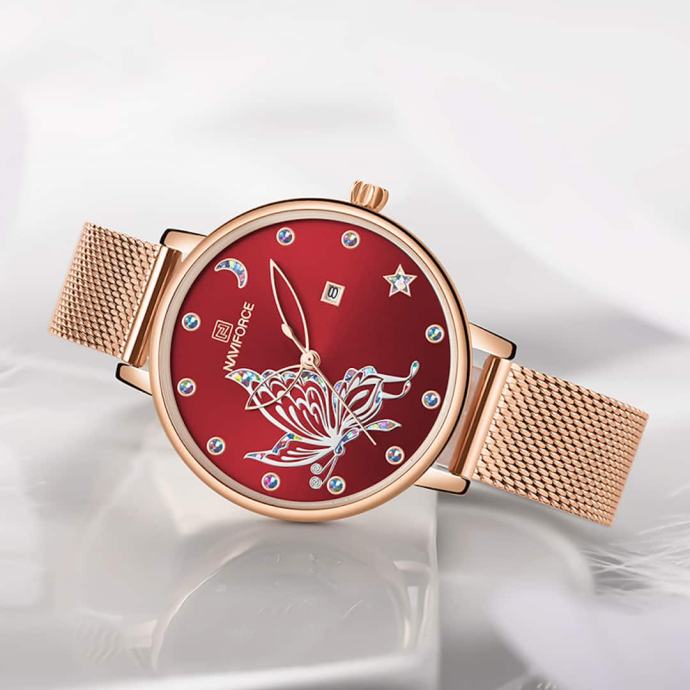 Ženska ročna ura NaviForce Butterfly RedŽenska ročna ura NaviForce Butterfly Red združuje eleganco in igrivost s sodobnim dizajnom. Ura je zasnovana z rdečo številčnico, okrašeno z motivom metulja in bleščicami, ki dodajo kanček leska in pritegnejo pozornost. Ženska ročna ura NaviForce Butterfly Red je odlična izbira za vse, ki iščete vsestranski modni dodatek.Lastnosti in prednosti ure: Privlačen motiv metulja: Edinstven motiv metulja z bleščicami na številčnici prinaša eleganten in sodoben pridih. Univerzalna uporaba: Ura se prilega tako formalnim kot sproščenim oblačilom, zato jo lahko nosite ob različnih priložnostih. Nastavljiv kovinski pašček: Kovinski pašček je preprost za prilagajanje, kar zagotavlja udobno nošenje ves dan. Lahka zasnova: Ura tehta samo 50 gramov, kar omogoča udobje in lahkotnost med nošenjem.Tehnične lastnosti: Velikost ohišja: 36 mm: Ohišje je dovolj veliko, da je ura opazna, a še vedno subtilna. Debelina ohišja: 8 mm: Tanka zasnova omogoča enostavno nošenje ure pod različnimi oblačili. Analogni mehanizem: Klasični analogni prikaz zagotavlja enostavno in hitro odčitavanje časa. Material ohišja: Kovina: Kovina zagotavlja trajnost in dolgotrajno uporabo ure. Pašček: Kovinski, nastavljiv: Nastavljiv kovinski pašček omogoča popolno prileganje zapestju. Barva številčnice: Rdeča z detajli v rose gold: Izrazita barvna kombinacija prinaša sodoben in eleganten videz.Zakaj izbrati žensko ročno uro NaviForce Butterfly Red?NaviForce Butterfly Red je popoln dodatek za tiste, ki želijo izstopati s stilom in eleganco. Z bleščečimi detajli in izrazito rdečo številčnico bo ta ura zagotovo dodala živahnost vsakemu videzu. Uživajte v brezčasni eleganci in prilagodljivosti ure, ki bo postala vaša najljubša izbira za vsak dan. Izberite NaviForce Butterfly Red in poudarite svojo osebnost s to čudovito uro!Razvajajte svoje ženske modne brbončice in si privoščite to sijajno elegantno ročno uro. Z nakupom ročne ure ne morete zgrešiti - mi pa vam obljubimo, da vam ne bo žal!V kolikor z nakupom niste zadovoljni, lahko ročno uro v roku 60-ih dni od prejema vrnete na naš naslov, mi pa vam bomo vrnili kupnino.Ročna ura ima 12 mesecev garancije.Ročna ura je idealna tudi za darilo, saj jo prejmete v elegantni darilni škatlici.