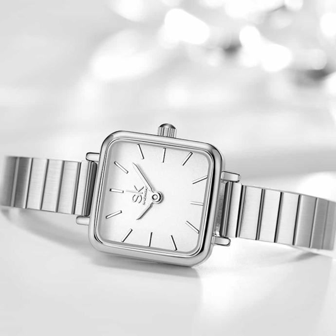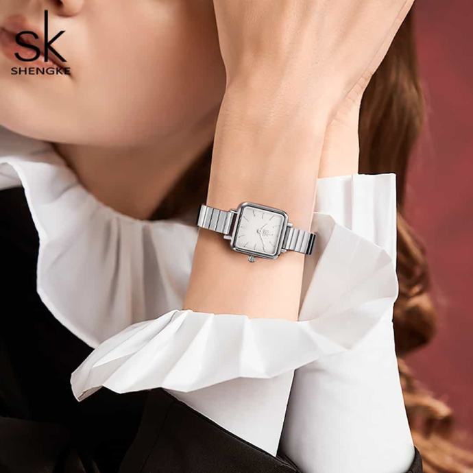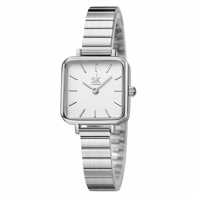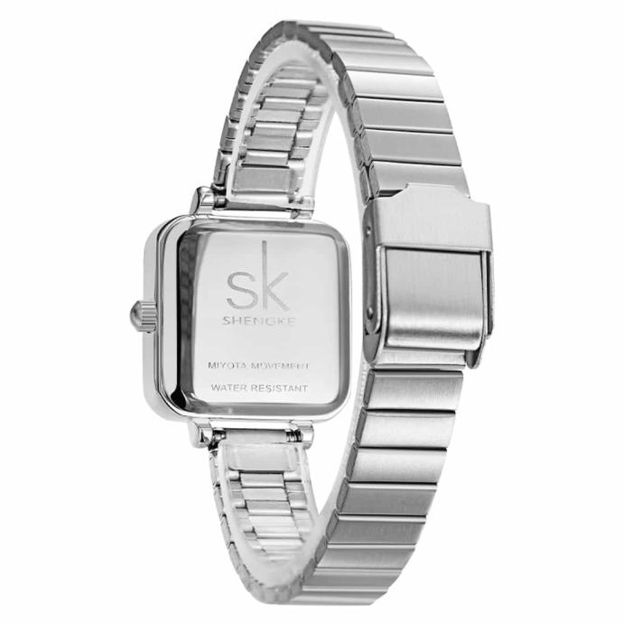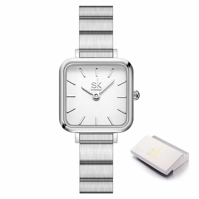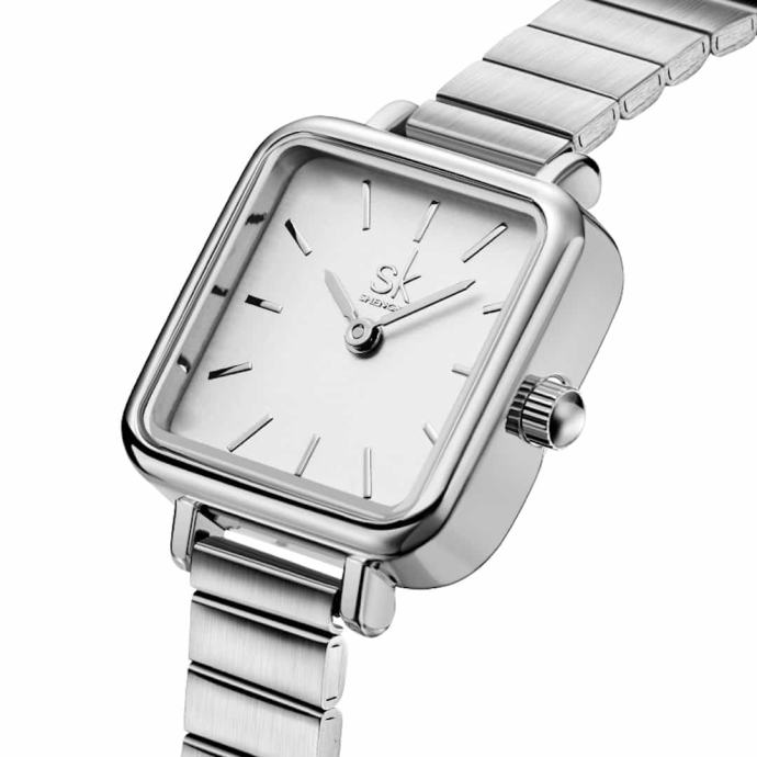 Ženska ročna ura SK Shengke Luxe SilverOdkrijte brezčasno eleganco z žensko ročno uro SK Shengke Luxe Silver. Ženska ročna ura SK Shengke Luxe Silver je sofisticirana ura in idealna izbira za ženske, ki cenijo minimalistični dizajn in vrhunsko kakovost.Lastnosti in prednosti ure Minimalistična zasnova: Čista srebrna barva in kakovostna številčnica ustvarjata sodoben in eleganten videz. Ta ura se popolnoma poda k poslovnim in casual oblačilom, kar vam omogoča, da jo nosite ob vseh priložnostih. Vzdržljivost: Izdelana iz visokokakovostnega nerjavečega jekla, kar zagotavlja dolgo življenjsko dobo. Nerjaveče jeklo je odporno proti koroziji in praskam, kar pomeni, da bo ura ohranila svoj sijaj in funkcionalnost tudi po dolgem času uporabe. Natančnost: Zanesljiv Quartz mehanizem zagotavlja natančnost in brezskrbnost. Kvarčne ure so znane po svoji izjemni točnosti, kar pomeni, da boste vedno točno vedeli, koliko je ura. Udobje: Kovinski pašček je prilagodljiv in udoben za nošenje skozi ves dan. Pašček je enostaven za prilagajanje, kar zagotavlja udobno prileganje različnim velikostim zapestja.Lastnosti ure Material ohišja: Nerjaveče jeklo – zagotavlja odpornost in trajnost, kar pomeni, da bo ura ohranila svoj prvotni videz tudi po dolgotrajni uporabi. Tip stekla: Mineralno steklo – odporno na praske in udarce, kar zagotavlja dolgo življenjsko dobo in jasen pogled na številčnico. Mehanizem: Kvarčni mehanizem – natančnost, prilagodljivost in zanesljivost. Tip paščka: Kovinski mrežasti pašček – prilagodljiv, udoben in stilski. Pašček je enostaven za čiščenje in vzdrževanje. Velikost ohišja: Premer 32 mm – idealna velikost za elegantno žensko uro. Širina paščka: 10 mm – idealna širina za udobno nošenje in eleganten videz. Debelina ohišja: 8 mm – zagotavlja, da je ura tanka in lahka, kar pomeni, da je udobna za nošenje skozi ves dan. Teža: 35 g – idealna teža za udobno nošenje, saj je ura lahka, a hkrati dovolj trdna in kakovostna.Ženska ročna ura SK Shengke Luxe Silver doda pridih prefinjene elegance vašemu videzu. Ne zamudite priložnosti, da postanete ponosna lastnica te čudovite ure. Naročite zdaj in uživajte v popolni kombinaciji stila in funkcionalnosti.V kolikor z nakupom niste zadovoljni, lahko ročno uro v roku 60-ih dni od prejema vrnete na naš naslov, mi pa vam bomo vrnili kupnino.Ročna ura ima 12 mesecev garancije.Ročna ura je idealna tudi za darilo, saj jo prejmete v elegantni darilni škatlici.