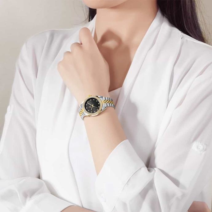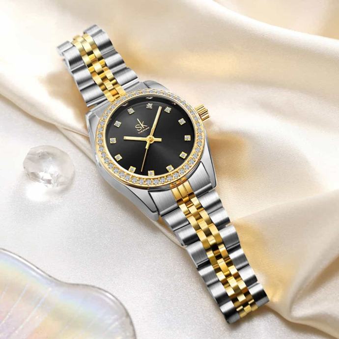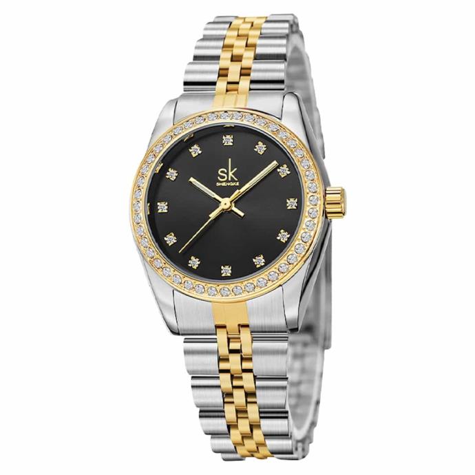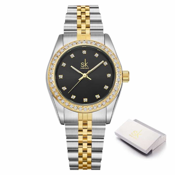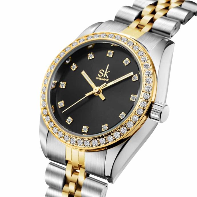 Ženska ročna ura SK Shengke Regal Black/GoldOdkrijte eleganco in prestiž z žensko ročno uro SK Shengke Regal Black/Gold. Ženska ročna ura SK Shengke Regal Black/Gold je čudovit kos, ki združuje luksuz in prefinjenost, ki bosta poudarila vaš stil ob vsaki priložnosti.Izjemne Značilnosti: Okvir ure (Bezel): Okvir ure je okrašen z majhnimi kristali, ki dodajo eleganco in sijaj celotnemu dizajnu ure. Vsak kristal je skrbno nameščen, da zagotavlja izjemen bleščeč učinek. Številčnica: Črna številčnica z zlatimi kazalci in oznakami za ure, ki so prav tako okrašeni s kristali. Luksuzen videz ure dopolnjuje subtilno svetlikanje kristalov na številčnici. Materiali: Kombinacija zlate in srebre barve na paščku ter ohišju ure ustvarja prefinjeno estetsko ravnovesje. Srebrno ohišje in pašček z zlatimi detajli zagotavljata eleganten in prestižen videz. Krona: Zlata krona ob strani ure omogoča nastavitev časa in dodatno poudarja luksuzen videz. Krona je enostavna za uporabo in dodaja eleganten pridih. Oznake za polne ure: Oznake za ure so narejene iz majhnih kristalov, kar povečuje eleganco in natančnost branja časa. Kristali ustvarjajo izjemen kontrast proti črni številčnici. Pašček: Pašček na tej uri je Jubilee pašček, ki je značilen po svoji zasnovi s petimi vrsticami – tri ozke in dve širši. Ta dizajn je hkrati eleganten in udoben za nošenje.SK Shengke Regal Black/Gold je več kot le ura – je izjava o vašem prefinjenem okusu in občutku za stil. Nosite jo ob vsaki priložnosti in dovolite, da postane vaš najljubši modni dodatek. Ura je idealna za ženske, ki cenijo eleganco in kakovost.Ne čakajte več! Dodajte pridih prefinjenosti svojemu vsakdanjiku z žensko ročno uro SK Shengke Regal Black/Gold. Naročite zdaj in postanite lastnica te čudovite ure, ki bo zagotovo obogatila vašo zbirko modnih dodatkov.V kolikor z nakupom niste zadovoljni, lahko ročno uro v roku 60-ih dni od prejema vrnete na naš naslov, mi pa vam bomo vrnili kupnino.Ročna ura ima 12 mesecev garancije.Ročno ura ura je idealna tudi za darilo, saj jo prejmete v elegantni darilni škatlici.