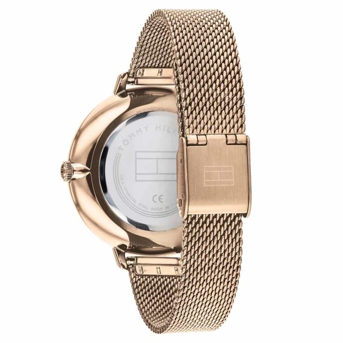 Ženska ročna ura Tommy Hilfiger 1782158Ženska ročna ura Tommy Hilfiger 1782158 je popolna izbira za sodobne ženske, ki iščejo minimalistično eleganco z modernim pridihom. S svojo prefinjeno rose gold številčnico in paščkom iz nerjavečega jekla izžareva prefinjen slog, ki se odlično ujema z različnimi oblačili. Tommy Hilfiger 1782158 ni le ura – je brezčasen modni dodatek, ki združuje estetiko in kakovost.Lastnosti in prednosti ure: Elegantno ohišje in pašček iz nerjavečega jekla: Rose gold obarvano nerjaveče jeklo zagotavlja trpežnost, odpornost proti obrabi in prestižen videz. Minimalistična številčnica: Posebno oblikovana številčnica brez številk, s prepoznavnim logotipom Tommy Hilfiger, poudarja sodoben dizajn. Vodoodpornost 3 ATM: Ura je odporna na vlago, rahel dež in prah, kar omogoča brezskrbno vsakodnevno uporabo. Tanka in lahka zasnova: Z debelino ohišja 6 mm in težo le 45 g nudi izjemno udobje pri vsakodnevnem nošenju.Tehnične lastnosti: Velikost ohišja: 38 mm – idealna velikost za elegantno in modno zapestno uro. Debelina ohišja: 6 mm – izjemno tanek profil omogoča udobno nošenje pod vsakim oblačilom. Material ohišja: Nerjaveče jeklo – zagotavlja odpornost proti praskam in dolgo življenjsko dobo. Pašček: Nerjaveče jeklo (mesh dizajn) – prilagodljiv in udoben mrežasti pašček s prefinjeno teksturo. Vrsta stekla: Mineralno steklo – odporno proti udarcem in praskam za dodatno zaščito. Mehanizem: Analogni kvarčni – zagotavlja natančnost in zanesljivost.Zakaj izbrati žensko ročno uro Tommy Hilfiger 1782158?Ženska ročna ura Tommy Hilfiger 1782158 je sinonim za prefinjen slog in kakovost. S svojo minimalistično obliko in prefinjeno rose gold barvo je popolna izbira za ženske, ki cenijo subtilno eleganco. Zaradi kakovostnih materialov in udobnega dizajna je odlična tako za vsakodnevno nošenje kot za posebne priložnosti. Dodajte svojemu videzu kanček modernosti s to čudovito uro Tommy Hilfiger!Ura ima 12-mesečno garancijo.V kolikor z nakupom niste zadovoljni, lahko ročno uro v roku 60 dni od prejema vrnete na naš naslov, mi pa vam bomo vrnili kupnino.Ročna ura je idealna tudi za darilo, saj jo prejmete v originalni Tommy Hilfiger darilni škatlici.