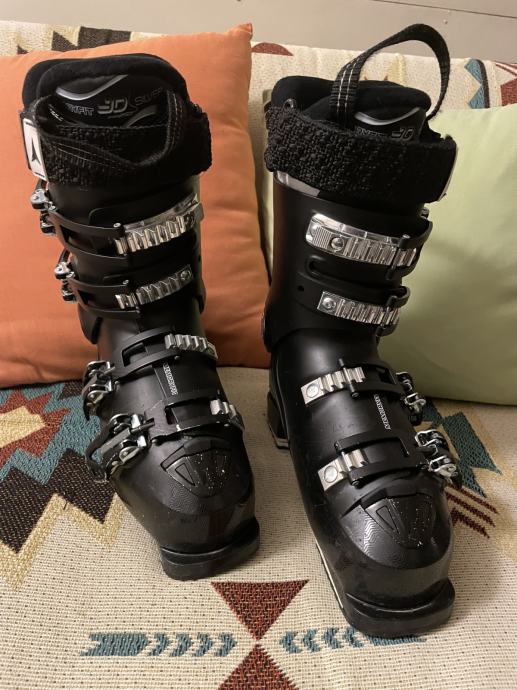 Prodam dobro ohranjene ženske smučarske čevlje velikosti 24/24.5, kar ustreza številki 38. Čevlji so primerni za smučarke z ožjimi stopali, po mojih izkušnjah so zelo udobni, lepo objamejo stopalo in omogočajo dober prenos sile. Namenjeni so smučarkam z osnovnim do srednje dobrim smučarskim znanjem, ki ne uporabljajo najtrših rekreativnih smuči.
