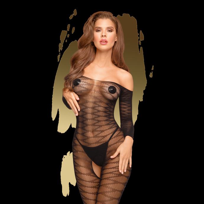 Prebudite divo v sebi in pustite, da vaši čari govorijo. V tem elegantnem oprijetem bodystockingu v črni barvi, boste uspešno zapeljale ljubimca. Zahvaljujoč dizajnu brez naramnic, spuščenim ramenom in dolgimi rokavi, daje ta bodystocking izjemno eleganten videz. Cik-cak vzorec pa bo laskal vašim oblinam. Bodystocking ima odprto mednožje tako, da se lahko ljubezenske igre začnejo takoj, ne, da bi se slekli. Bodystocking v črni barvi Odprto mednožje Cik-cak vzorec Spuščena ramena in dolgi rokavi Mehek ter elastičen material