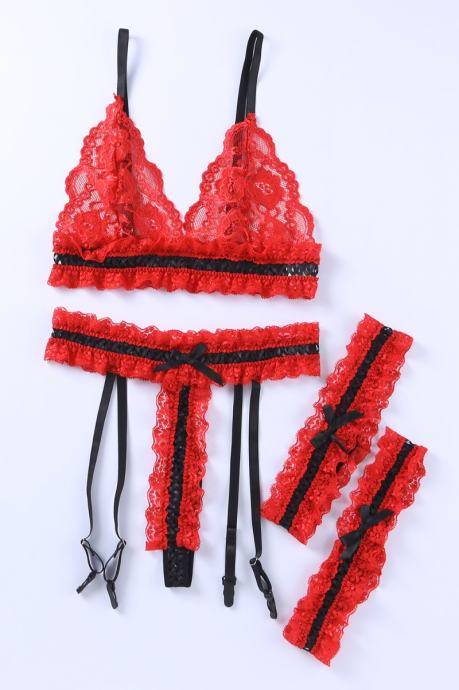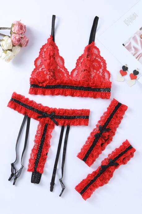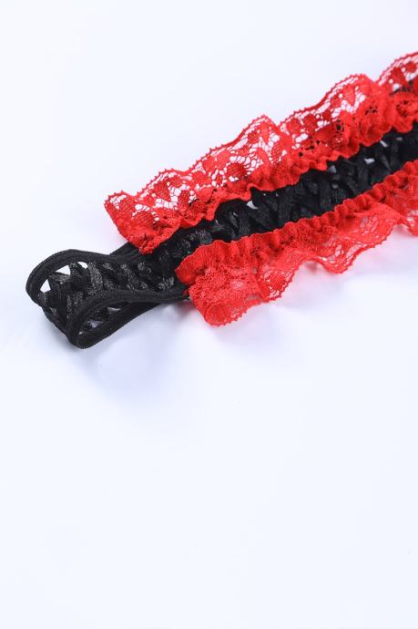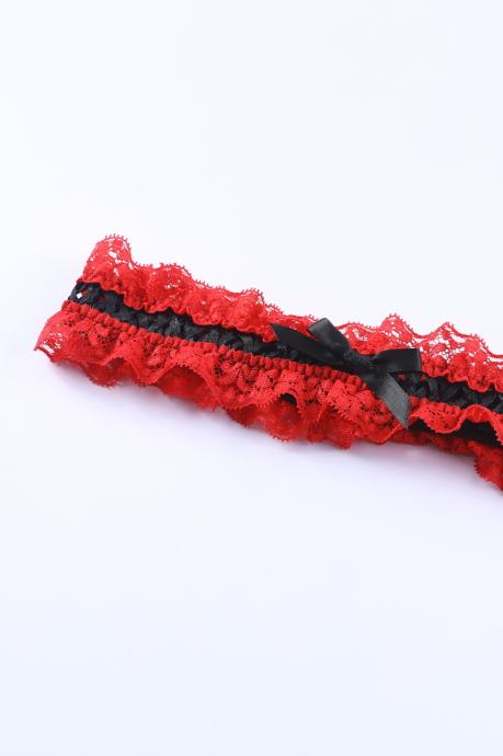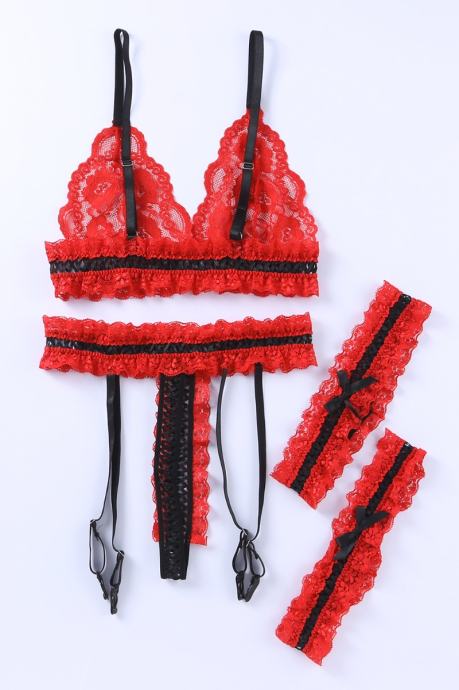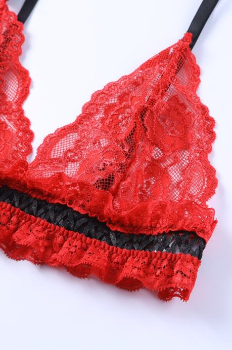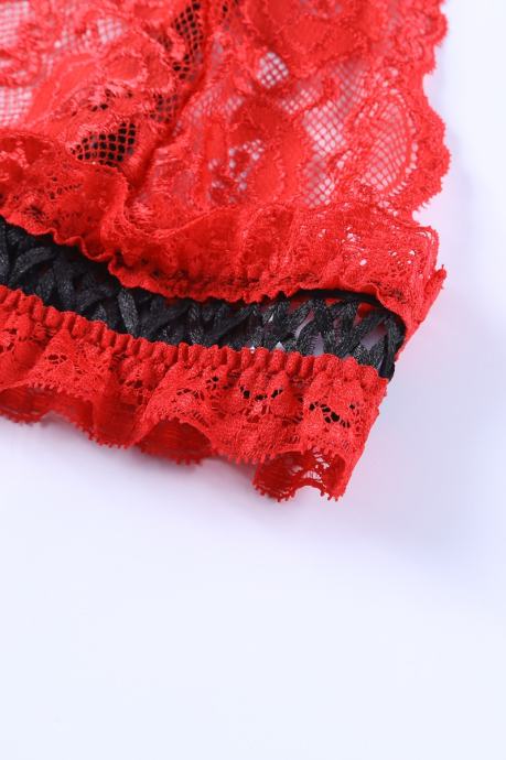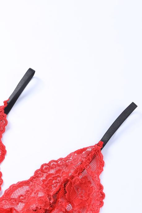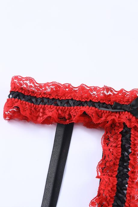 Nesramno vroče spodnje perilo za dopolnitev vaše kolekcije. Komplet Alaia je sestavljen iz nedrčka, tanga hlačk s pasom za nogavice in podvezicami. Narejen je iz izjemno raztegljivega materiala in je v celoti sestavljen iz rdeče čutne čipke, ki je izjemno mehka in prijazna do kože. Čipkast nedrček z naborki in pas za podvezice imata nastavljive trakove, podvezici sta izjemno elastični in udobni. Črni trakovi in pentlje so vroči detajli, ki še bolj popestrijo celoten izgled. - 3-delni komplet - Čutna rdeča čipka s črnimi detajli - Mehak in udoben kroj - Raztegljiva tkanina - Nedrček z nastavljivimi naramnicami - Tanga hlačke in pas za nogavice z nastavljivimi trakovi - Elastični in udobni podvezici