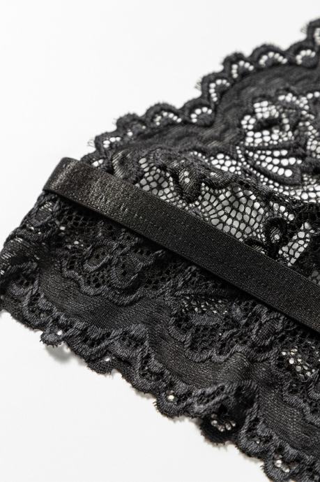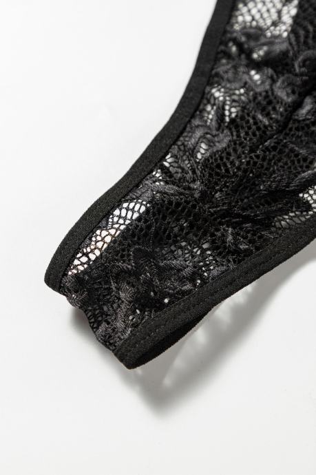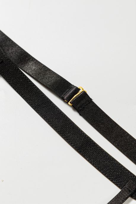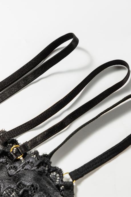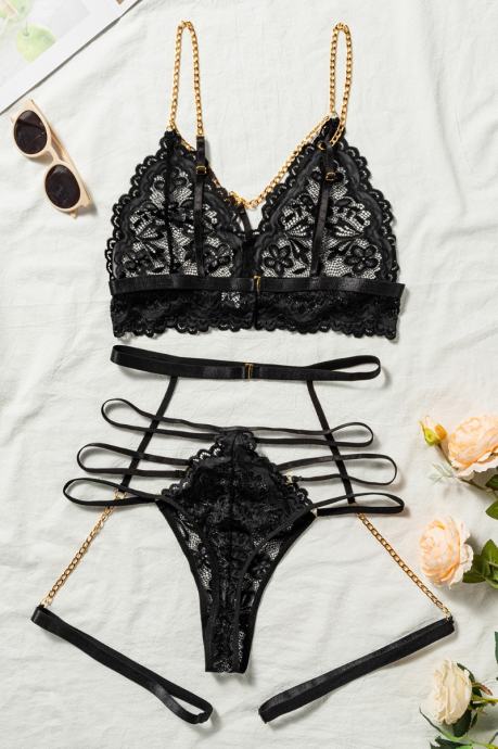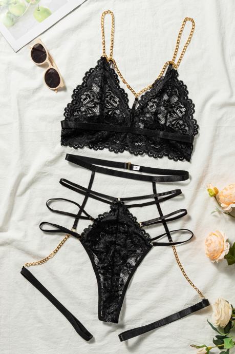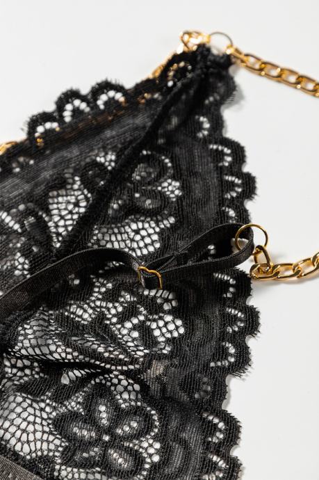 Spremenite se v seksi divo. Čudovit komplet Anastasia bo dopolnil vaš izgled in vas naredil seksi, izzivalno in hkrati elegantno. Vključuje nedrček, tanga hlačke in pas s podvezicami. Nedrček je nepodložen in ima nastavljive naramnice. Oprsje obroblja zlata verižica, ki preusmeri pogled na bujen dekolte in se hkrati vidi, če ga nosite pod majico ali obleko z globljim izrezom. Tanga hlačke imajo visok pas, kar vizualno podaljša vaše noge, pas pa ima podvezice povezane s prav tako zlato verižico. Komplet je čudovitega kroj in primeren za posebne priložnosti. Tri delni komplet Nedrček Tanga hlačke z visokim pasom Pas s podvezicam Nedrček in pas krasi zlata verižica Mehak in raztegljiv material Udoben kroj
