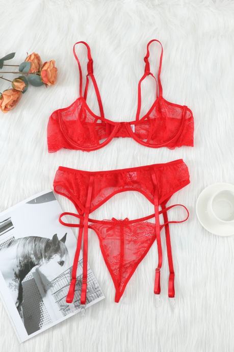 Rdeče erotično perilo je vedno prava izbira. Komplet Flora Red vključuje nedrček, tanga hlačke in pas za nogavice, izdelane iz elegantne čipke. Komplet ima mehek in elastičen material ter nastavljive naramnice za popolno prileganje. Na voljo je v zapeljivem rdečem odtenku, ki je primeren za vse priložnosti. 3-delni komplet: Nedrček, tanga hlačke, pas za nogavice Nastavljive naramnice in trakovi Mehek in elastičen material V rdeči barvi
