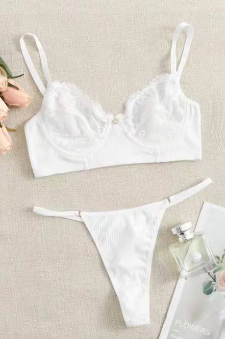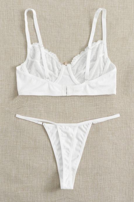 Komplet nedrčka in tangic, v katerem boste izgledali zelo seksi, očarljivo in elegantno. Komplet je izdelan iz mehkega, zračnega, lahkega in udobnega materiala. Nedrček ima mehke košarice iz čipkastega materiala z žičnato oporo in nastavljive naramnice. Tanga hlačke so mehke in udobne za nošenje. - Dvodelni komplet - Nedrček z mehkimi košaricami in žičnato oporo - Nastavljive naramnice - Mehak in udoben material - Kombinacija čutne čipke in neprosojnega materiala - Bela barva